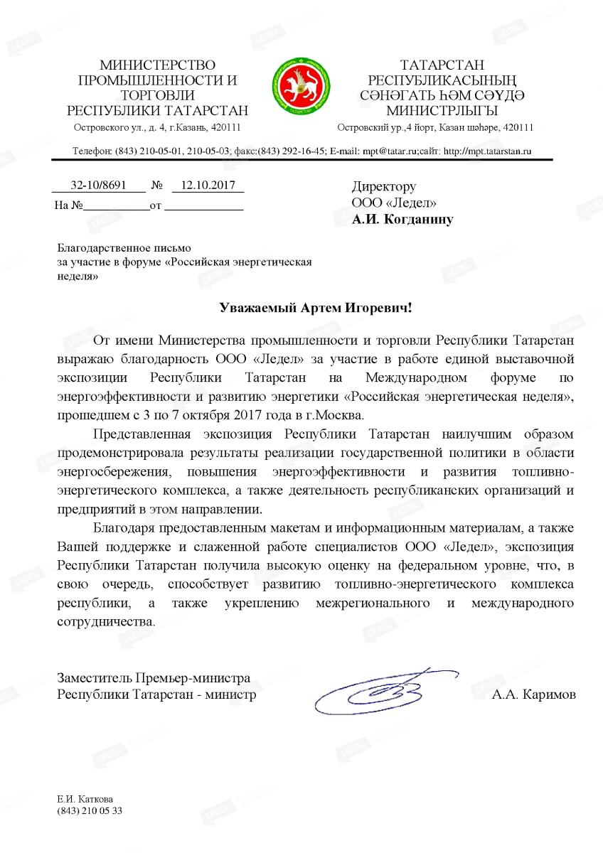 Благодарственное письмо за участие в форуме "Российская энергетическая неделя"