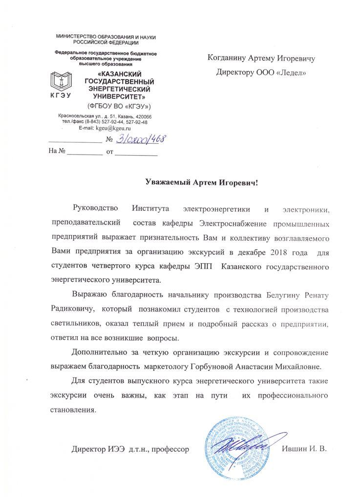 Благодарственное письмо от ФГБОУ ВО "КГЭУ"